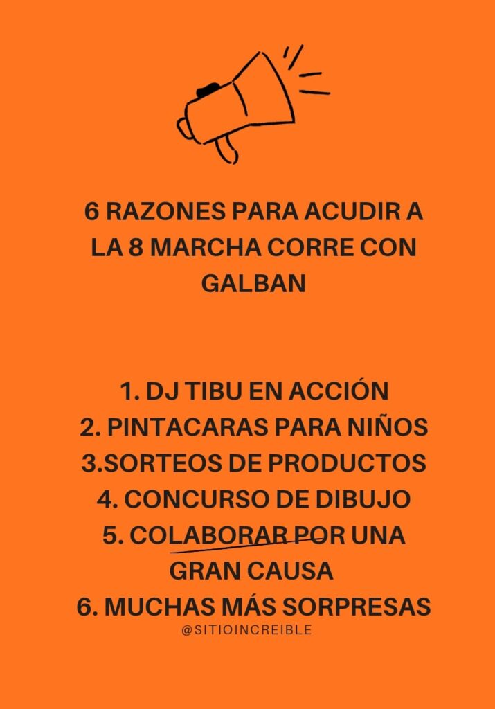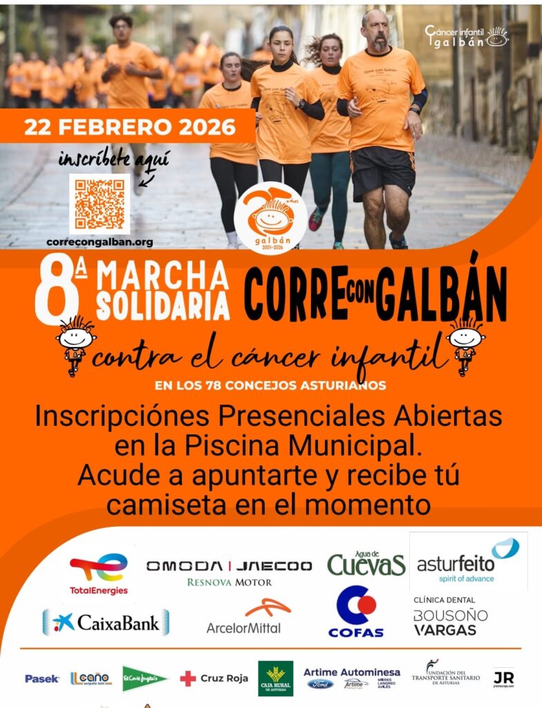 La Carrera/Marcha Solidaria “Corre con Galbán” 2026 se celebrará el domingo 22 de febrero en los 78 municipios de Asturias, tiñendo de naranja toda la región en apoyo a la lucha contra el cáncer infantil. La inscripción cuesta 6 € e incluye camiseta conmemorativa por el 25º aniversario de la Asociación Galbán.
